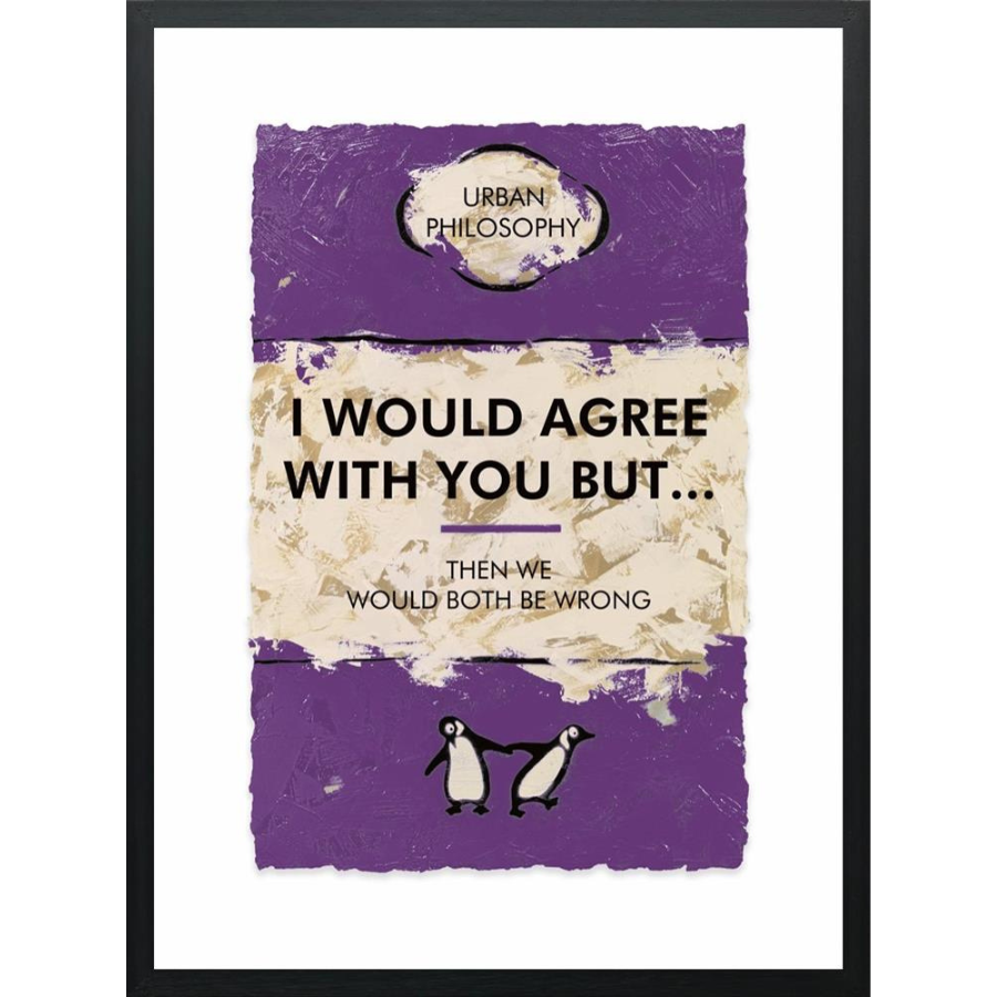 Playful, bold, and thought-provoking, this limited edition artwork by Hue Folk brings a touch of wit and character to any space. Featuring the words “I would agree with you but… then we would both be wrong” in striking typography, the piece blends humour with sharp urban style.