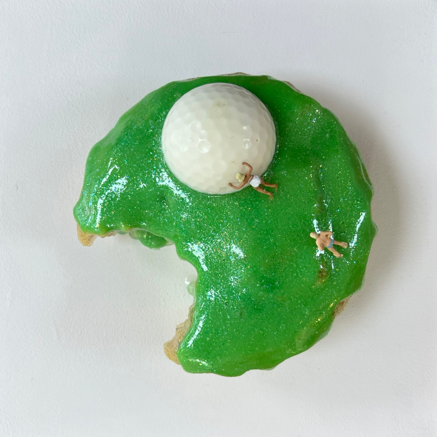 This playful resin sculpture blends sporting spirit with a sweet sense of humour. 'Tee Break' transforms a classic glazed doughnut into a miniature golf green — complete with a tiny reclining figure and golf ball poised mid-putt.